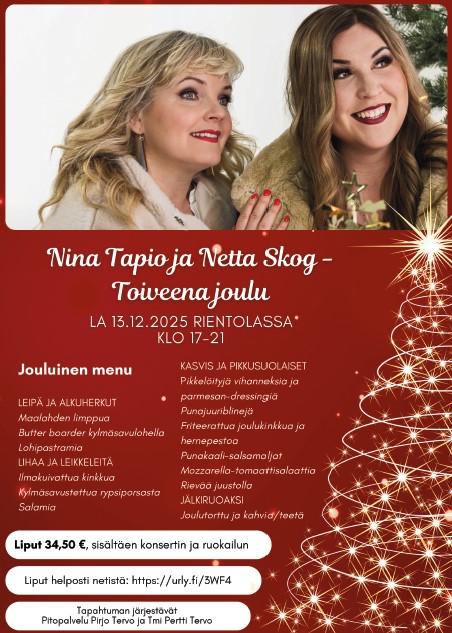 La 13.12.2025 klo 17-21 Nina Tapio ja Netta Skog: Toiveena Joulu. Sis. jouluinen tapas menu. Kts. alta ilmoitus tarkemmin.