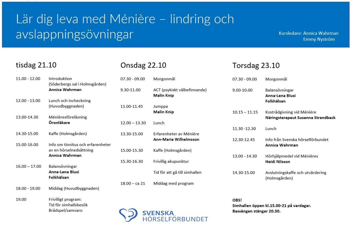 Program: Hörselrelaterade föreläsningar om Ménière. Avslappningsövningar, lindring och psykosocialt stöd.